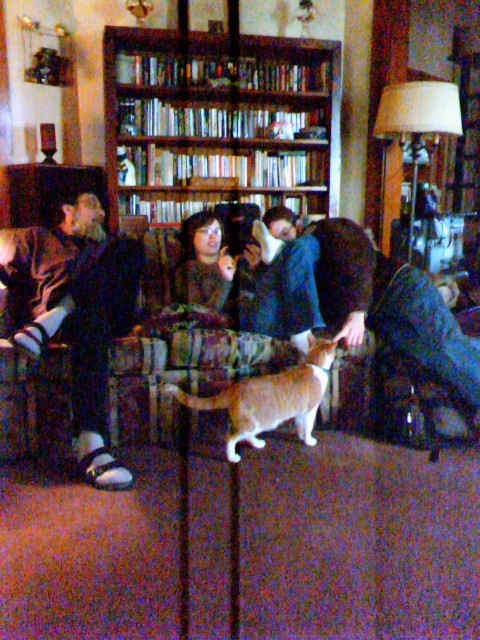 It seems like every time we make plans to head into Lincoln to visit the Voelkers, something happens to keep that from happening. One time was spent in a snowy ditch after we drove right off the interstate exit curve during white-out conditions. Just before Christmas, the kid was sick and the weather was crap. But today we finally made it in and spent a delightful day hanging out with Jo and Tom, GΓΌnter, Beca and Hannah. And the kitties π Even got a call from dad during it, so that was lovely π
